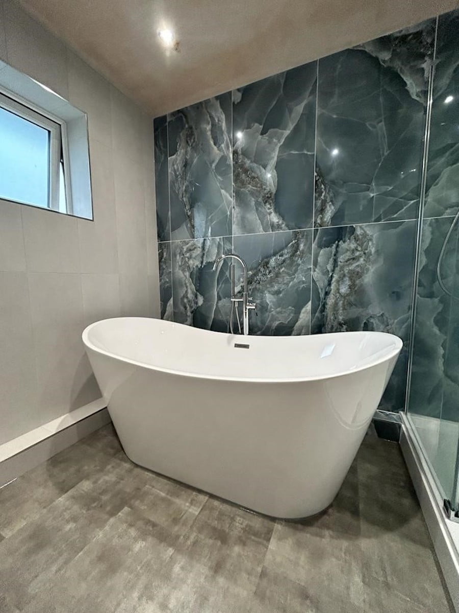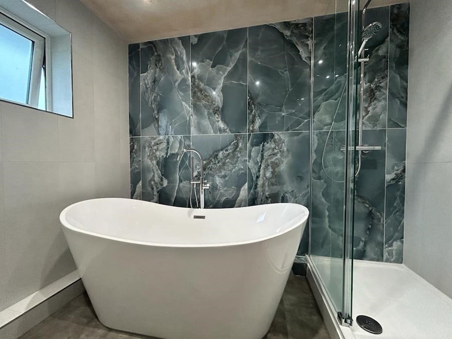 Incorporating 300×900 tiles in a portrait layout throughout the majority of the room, we created a sense of space and sophistication. To introduce a captivating focal point, 1200×600 patterned tiles were meticulously fitted to the main bath wall, adding visual interest and depth to the design.